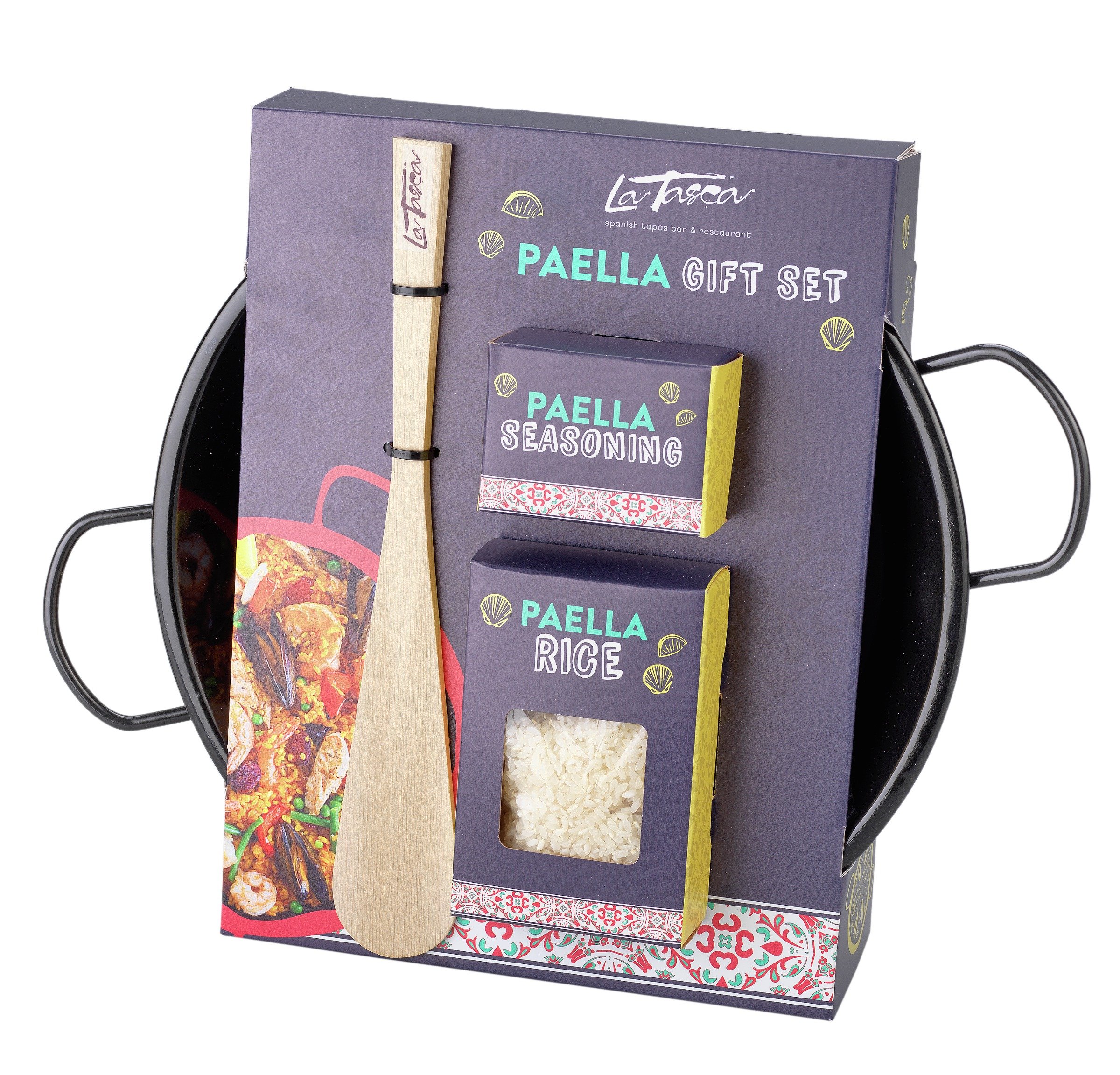 La Tasca Paella Gift Set La Tasca Paella Gift Set Rustle up an authentic Valenician Paella using these traditional cooking methods and tools. This gift is packed with everything you need to make the perfect paella, including an enamel ..